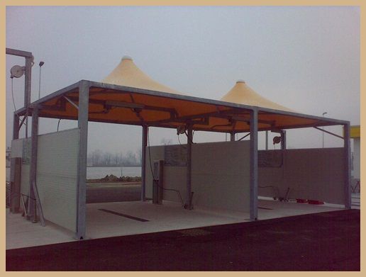 Gazebi impermeabili a scarico neve costituiti da strutture in ferro zincato bagnato a caldo, alluminio o legno. Piantoni tondi o quadrati, traverse in appositi profili contenenti gli elementi per il fissaggio dei teli PVC, crocere e controventature in tubolari tondi. Grondaie incorporate e scarichi attraverso i piantoni (optional).