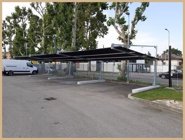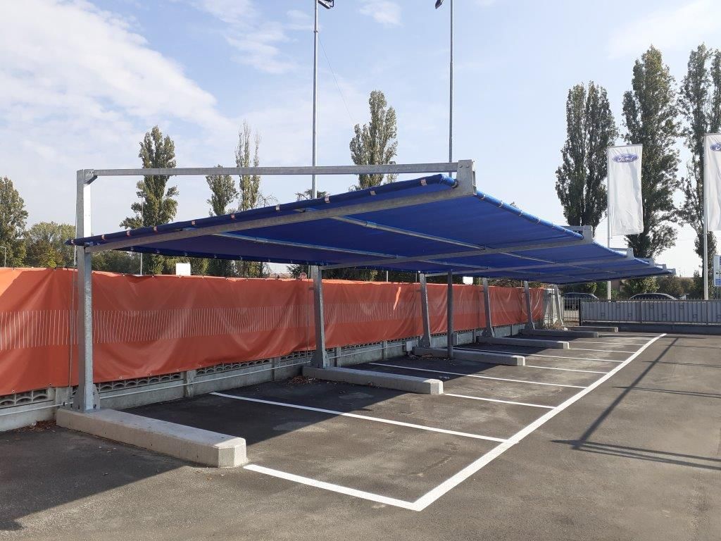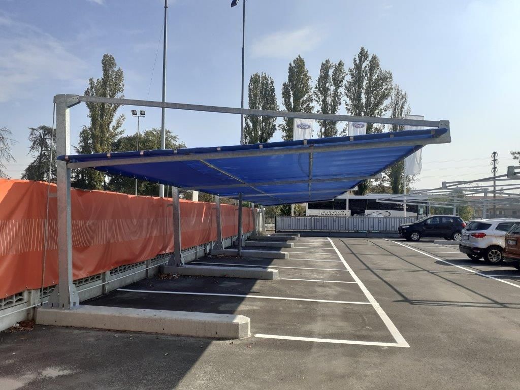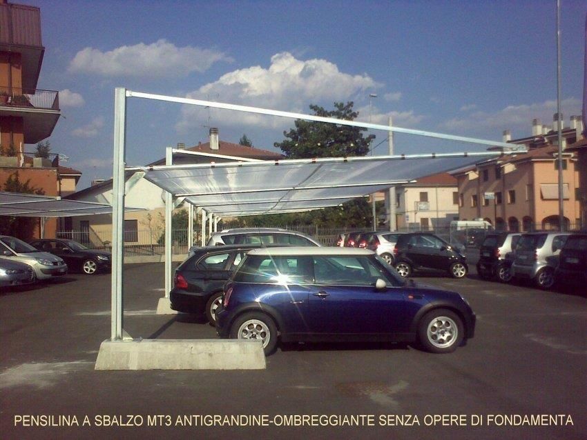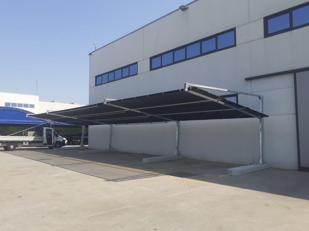 Questa tipo di struttura ha tutti i piantoni arretrati a sbalzo ed è l’ideale per un parcheggio automezzi o stoccaggio merci.